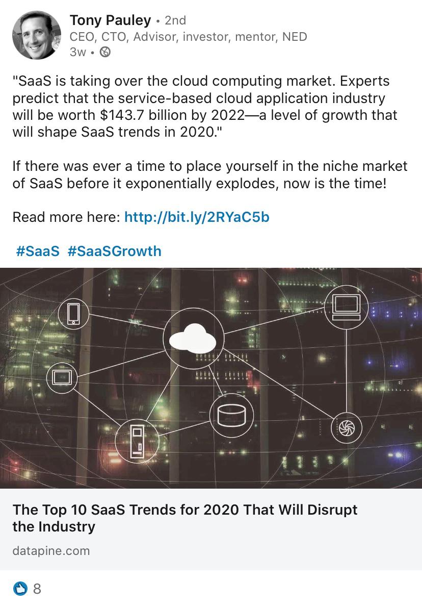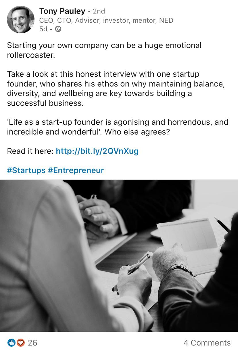 In order to nurture this growing audience, Tony is also subscribed to the £100 Posts Plan; under this plan, Tony’s UK-based 100 Pound Social Content Team create and publish three posts per week to Tony’s personal LinkedIn profile.
