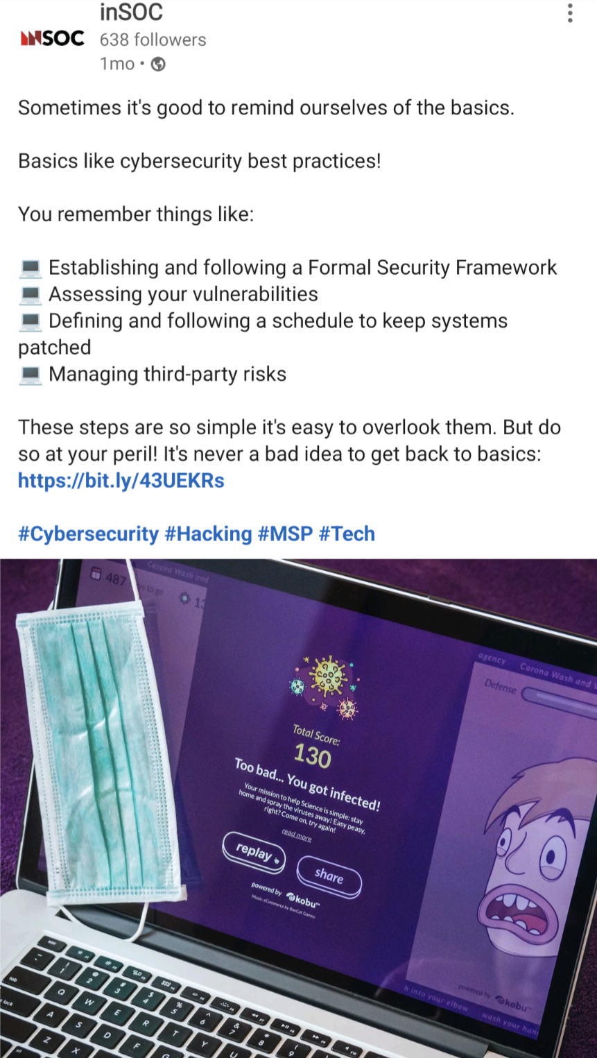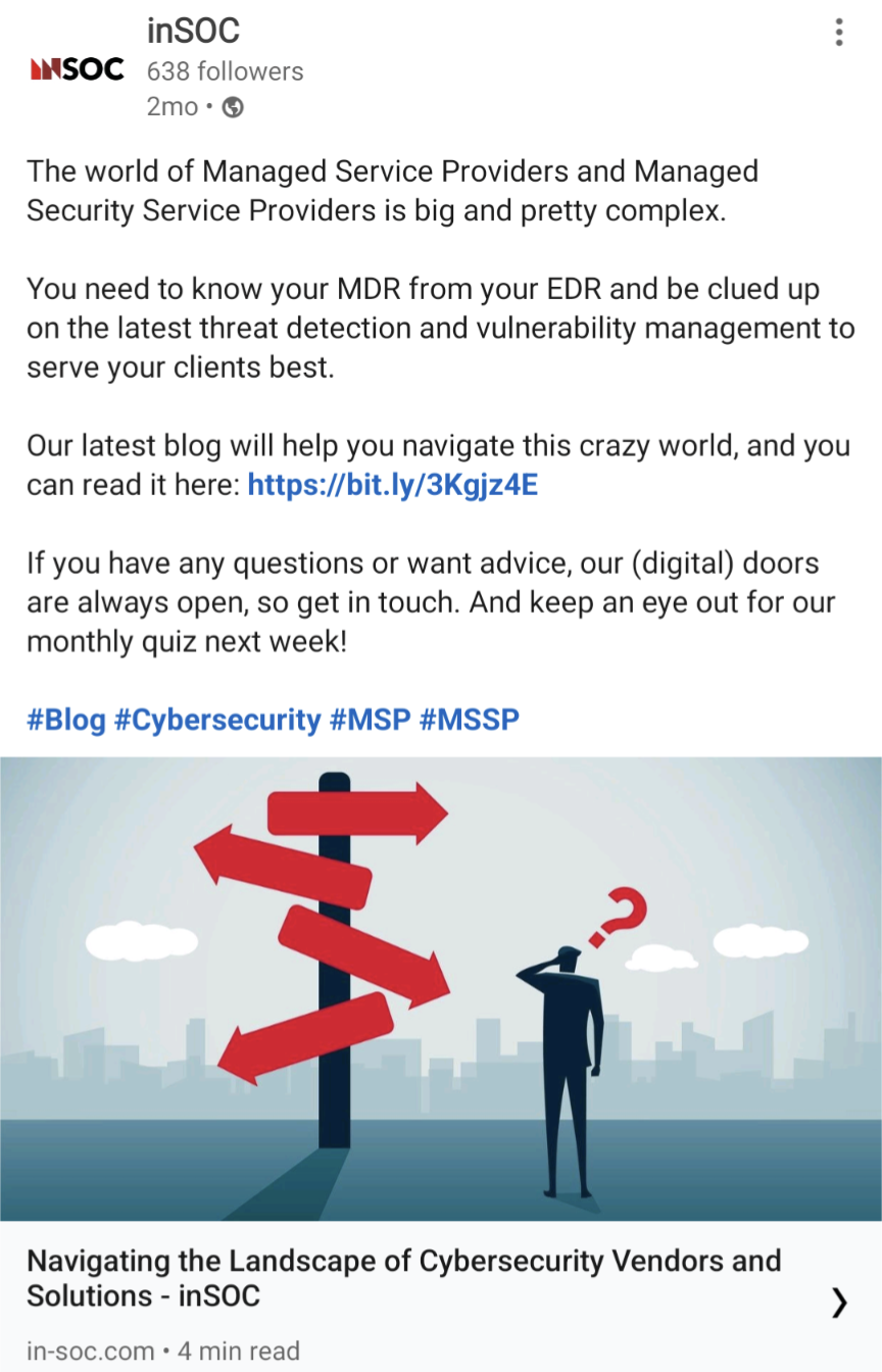 As their website is ‘serious and informative’, inSOC requested that their social media posts take on a different tone of voice for a wider audience; conveying a more personable and entertaining side whilst still being informative at the core.