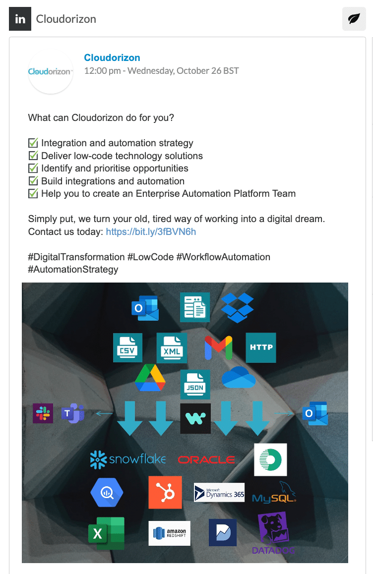 Lee also reports that Workato, for whom Cloudorizon are a Platinum Partner, were impressed with the company’s improved social media marketing.