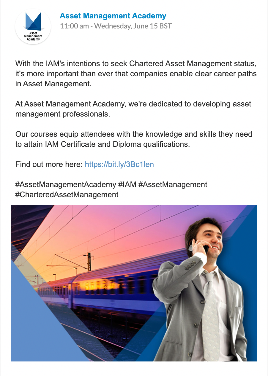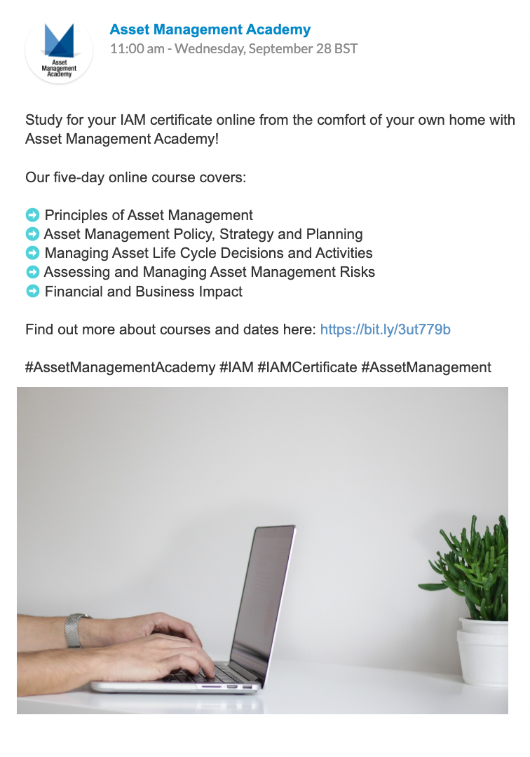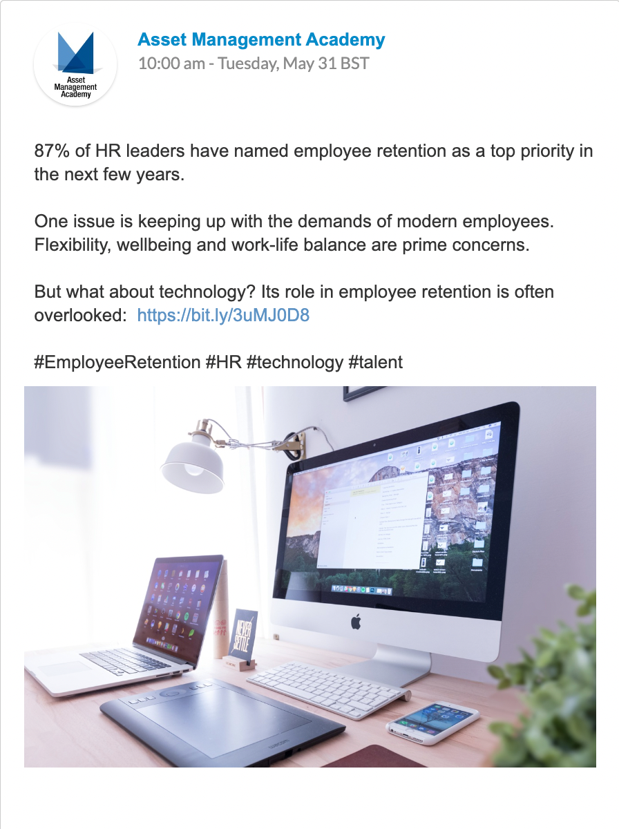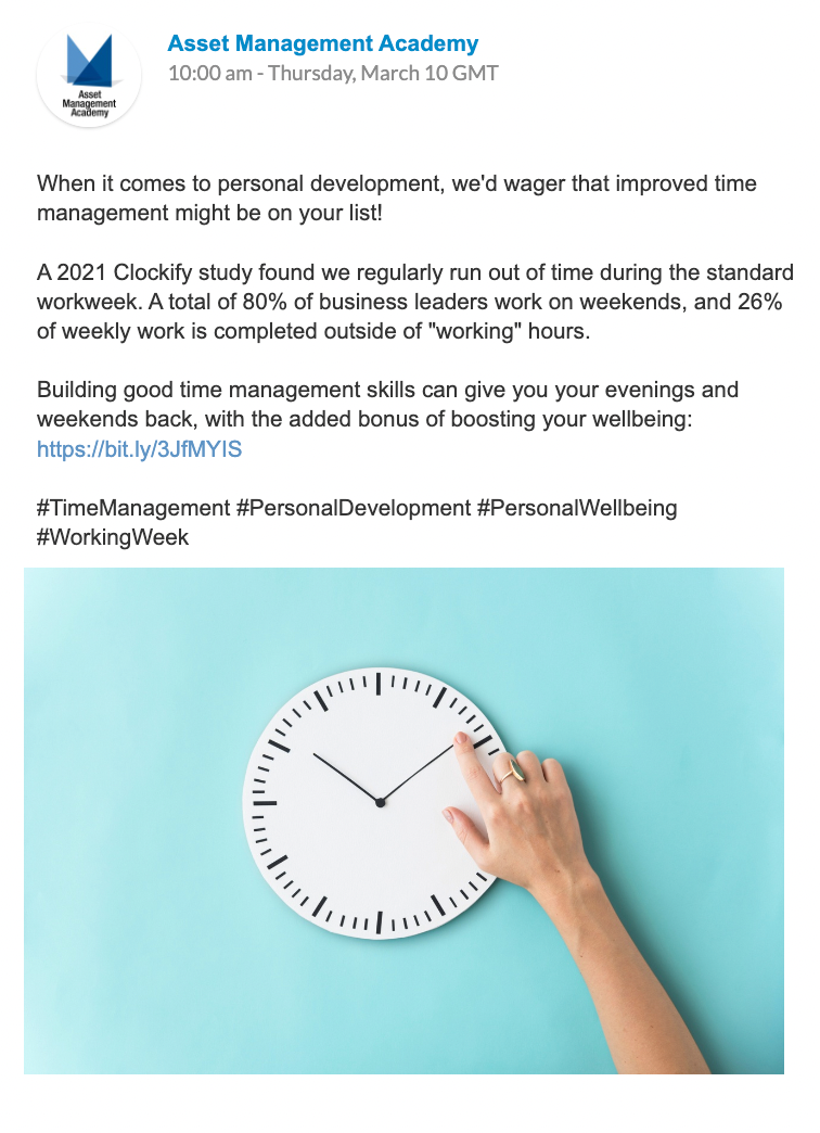 Asset Management Academy signed up for our Posts Plan, with regular posts each week to the company’s LinkedIn and Twitter pages.