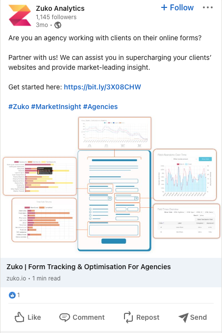 Zuko signed up for our Posts Plan, featuring regular posts to the company’s Twitter and LinkedIn pages.